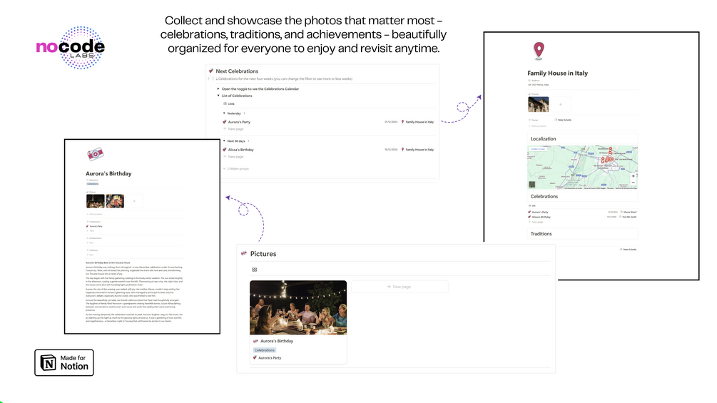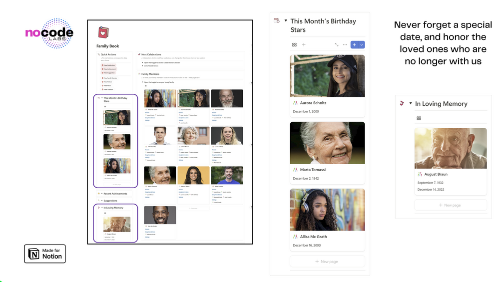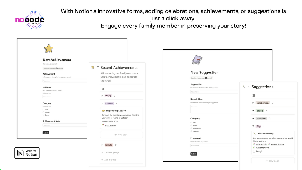- Effortlessly update and add new events, memories, and information using Notion’s forms.