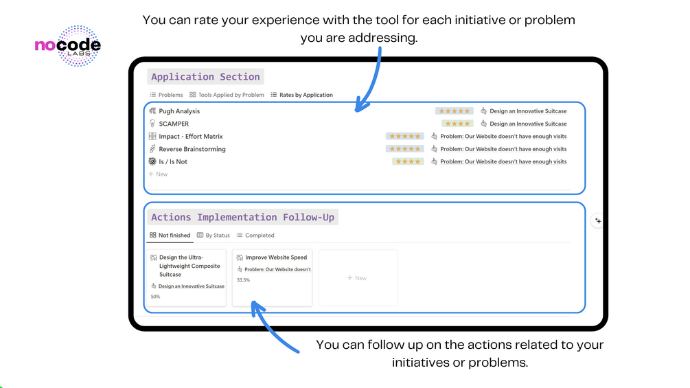 This database serves as the central hub for your problem-solving activities. It helps you define the problem and provides a structured sequence to deploy the tools. Inside this database, you'll find a template that outlines the entire problem-solving scheme, with intuitive buttons for deploying specific tools such as the Is/Is Not Matrix, SCAMPER, and Reverse Brainstorming. -