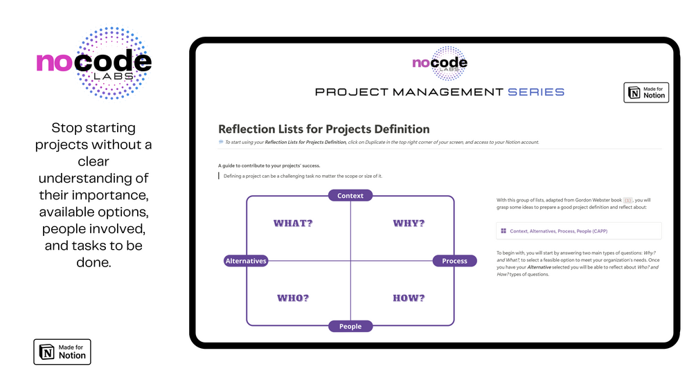 You will find a Notion page with more than 30 questions related to: Context, Alternatives, People, and Process to elaborate your project definition. Those questions are “things to reflect about” so, maybe you don’t have an answer at the very beginning of the project, but you probably put some on your radar and they will help you when things are clearer.